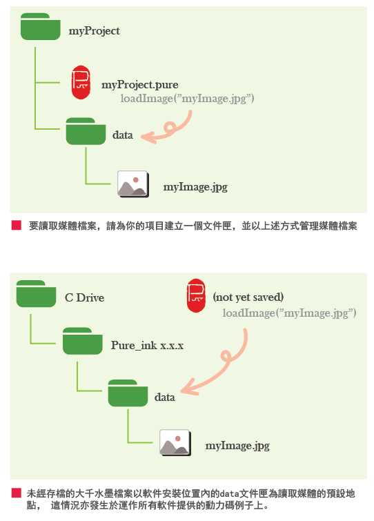 請注意,若你直接於大千水墨軟件內執行軟件所提供的動力碼範例(於上方選單選「Kinetic Force > Examples」),而你的大千水墨檔案尚未事先儲存,那麼軟件會從安裝大千水墨軟件的目錄之『data』資料夾中尋找媒體檔案。由於安裝軟體時,系統已將相關的媒體檔案複製到那個『data』資料夾中,因此這做法是可行的,你會成功執行動力碼並看見相關媒體檔案的顯示。相反,如果你在事前已將大千水墨檔案儲存到特定目錄的情況下去執行那些動力碼範例 ,則會無法載入那些媒體檔案,除非你把那些媒體檔案移動到該目錄內的『data』資料夾中。